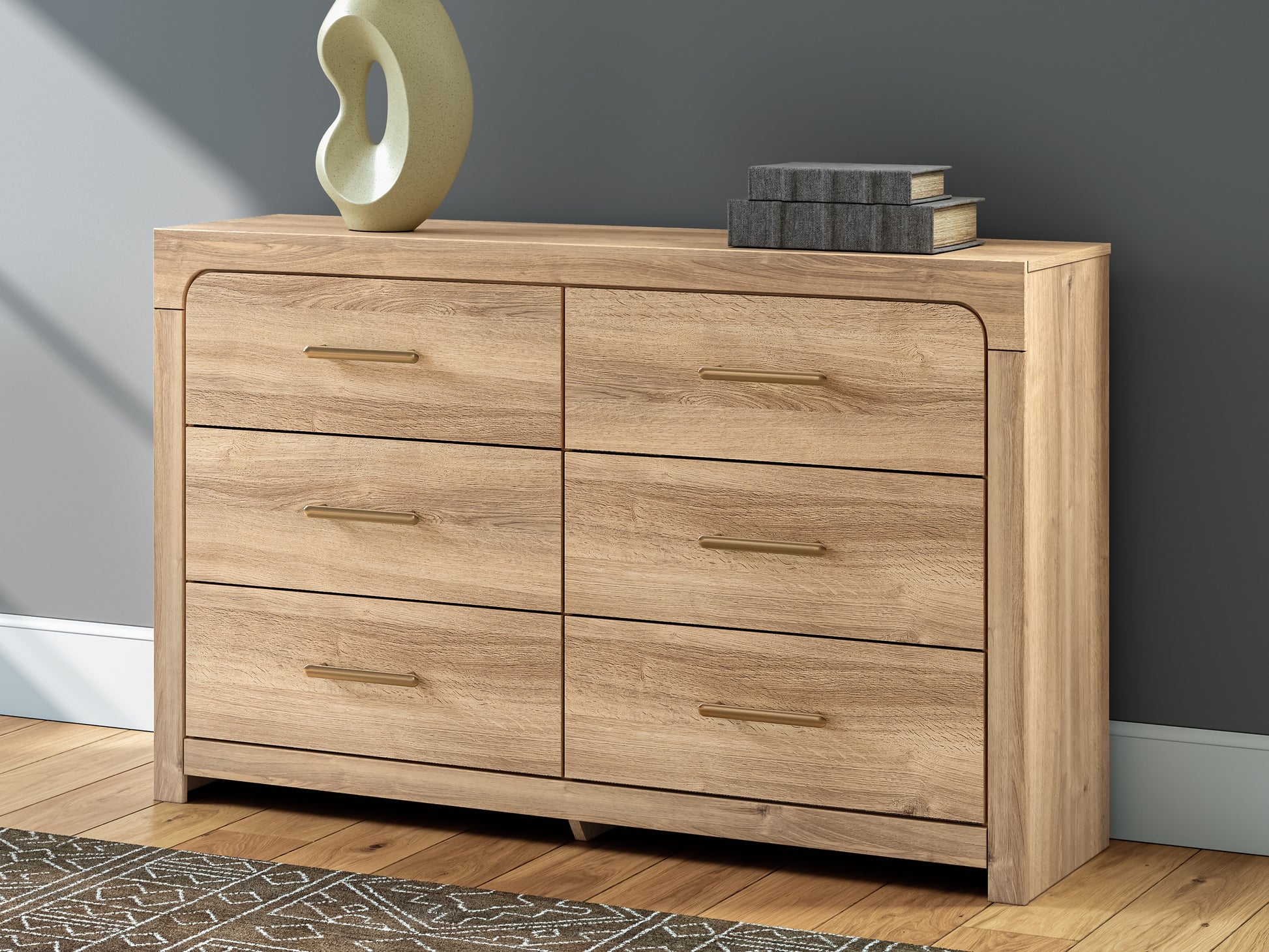 The natural wood tones and clean lines of this dresser echo your easygoing style sensibilities. With a warm finish and replicated oak grain, its carefree character lightens up your bedroom. Curved inner corner details soften the look, while sleek bronze-tone hardware modernizes the feel.